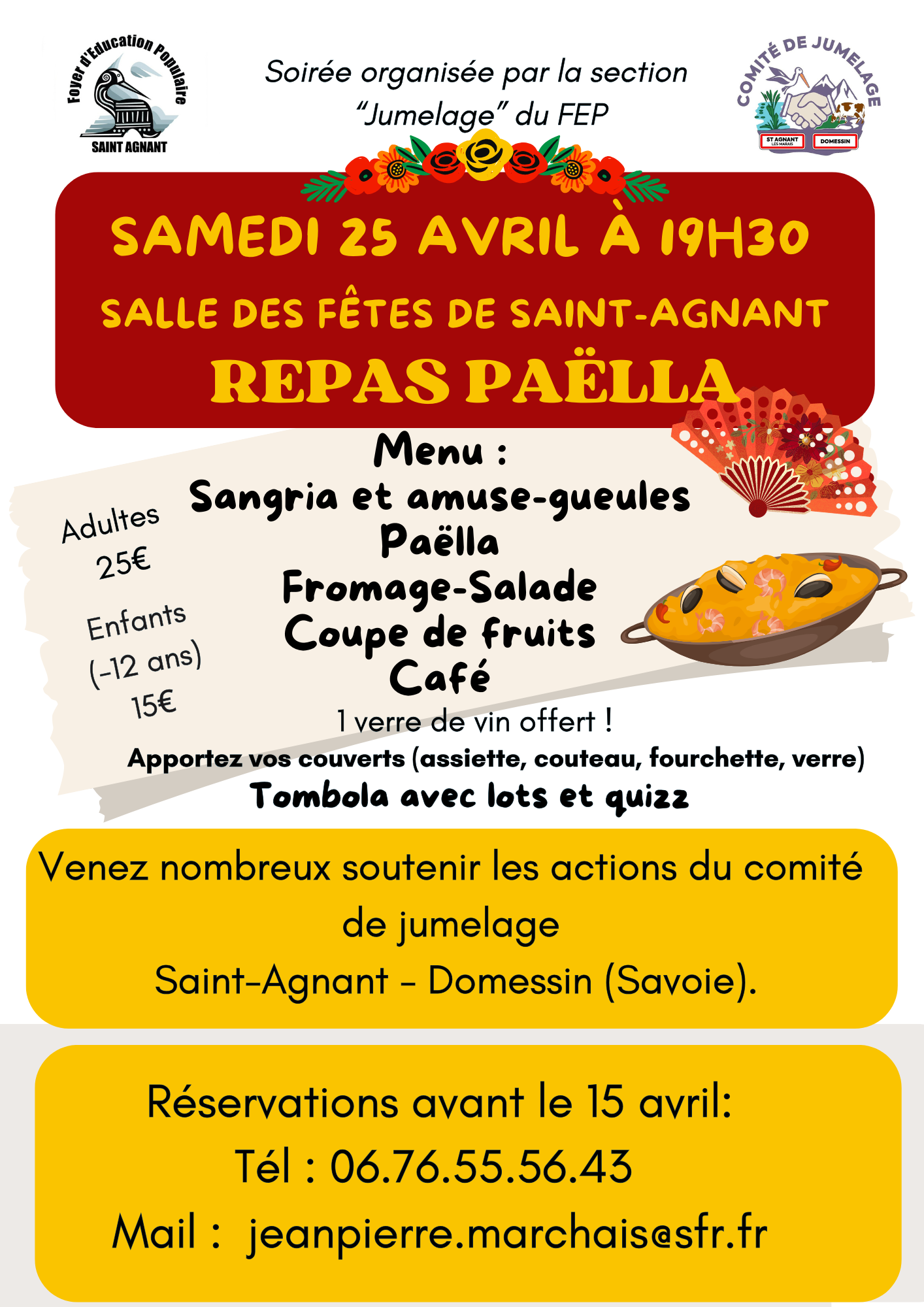 FEP Section Jumelage – Repas Paëlla FEP Jumelage Repas Paëlla pdf | 236,98 Ko | 12 Mars 2026 Télécharger + Ajouter à mon Agenda Google + iCal / Outlook export 00 jours 00 heures 00 minutes 00 secondes Date 25 Avr 2026 Heure 19:30 Lieu Salle des fêtes de Saint-Agnant Partagez cet événement mars 2026 Mar 19 2026 Cérémonie 19 mars Place de Verdun Mar 28 2026 Loto organisé par les K’mels du désert Salle des fêtes de Soubise avril 2026 Avr 06 2026 Chasse aux oeufs Pas des Vaches Avr 12 2026 Bourse à l’enfance – Nos Ptits Papillons Place de Verdun Avr 18 2026 ESAB96 : marche gourmande Avr 25 2026 FEP Section Jumelage – Repas Paëlla Salle des fêtes de Saint-Agnant Pas d'événement actuellement programmé.