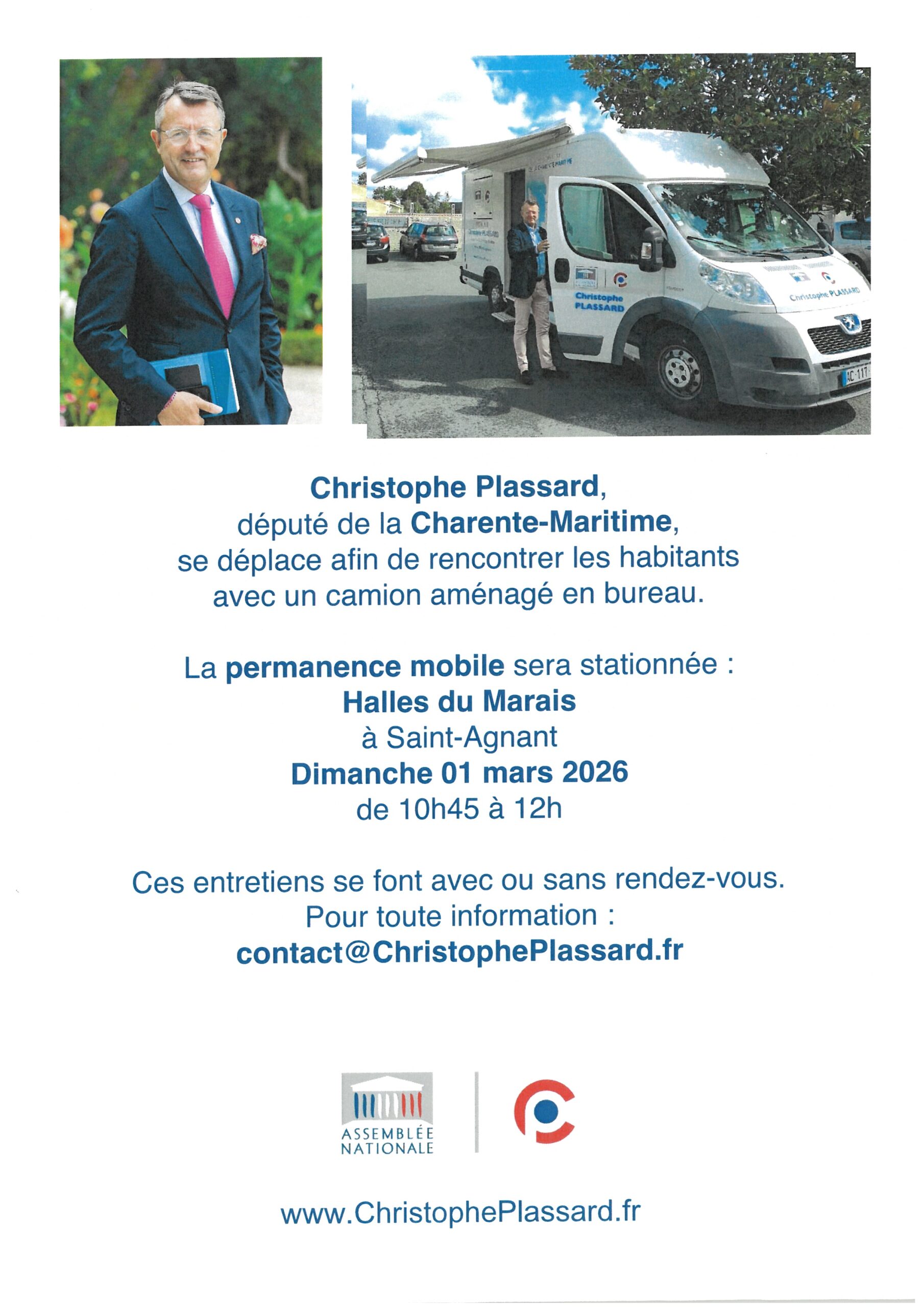 Permanence mobile Christophe Plassard + Ajouter à mon Agenda Google + iCal / Outlook export 00 jours 00 heures 00 minutes 00 secondes Date 01 Mar 2026 Heure 10:45 - 12:00 Lieu Halles du Marais 3 avenue de Villeneuve Partagez cet événement mars 2026 Mar 01 2026 Permanence mobile Christophe Plassard Halles du Marais Mar 06 2026 Carnavaboum Mar 07 2026 Super Loto organisé par le SABC Salle des fêtes de Soubise Pas d'événement actuellement programmé.