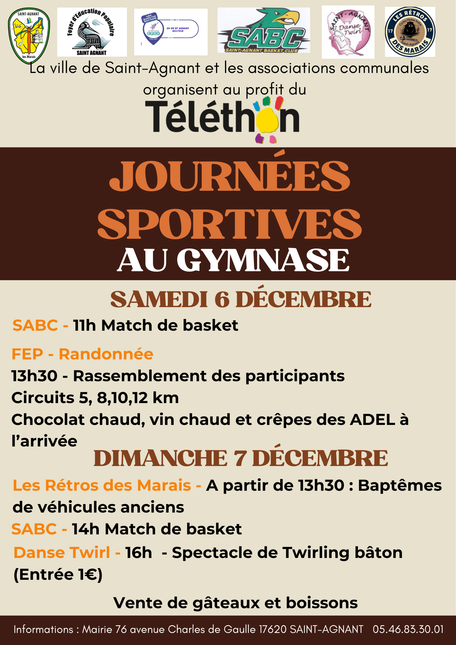 Téléthon-Journées sportives + Ajouter à mon Agenda Google + iCal / Outlook export 00 jours 00 heures 00 minutes 00 secondes Date 06 - 07 Déc 2025 Heure 11:00 - 18:00 Lieu Gymnase de Saint-Agnant Partagez cet événement novembre 2025 Nov 29 2025 Animation à la médiathèque Médiathèque décembre 2025 Déc 06 - 07 2025 Téléthon-Journées sportives Gymnase de Saint-Agnant Déc 06 2025 Soirée Pot-au-Feu en faveur du Téléthon Salle des fêtes de Saint-Agnant Déc 09 2025 Théâtre de la Coupe d’Or – Cirque et Théâtre « Pling-Klang » Salle des fêtes de Saint-Agnant Pas d'événement actuellement programmé.